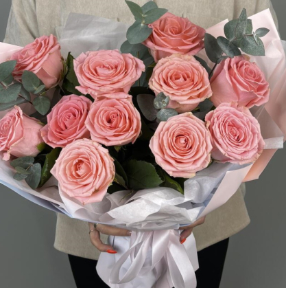 Буукет 11 розовых роз с эвкалиптом | Купить с доставкой в Королеве