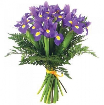 Очень красивые букет из фиолетовых ирисов. Добавлена зелень - папоротник. Букет выполнен под ленту, но можно и добавить упаковку.