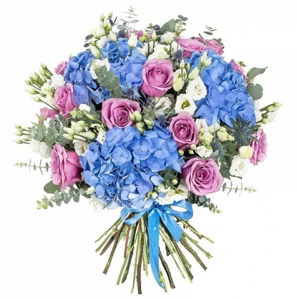 Прекрасный букет из роз, гортензий и эустомы с добавлением эвкалипта.