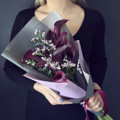 Букет из 9 фиолетовых калл с лимониумом | Купить в Королеве