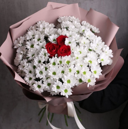 Букет хризантем с розами в центре | Заказать цветы в Королеве