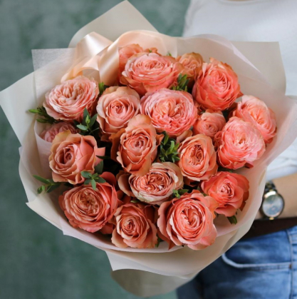 Букет из пионовидных роз с добавленем фисташки, в стильной матовой упаковке
