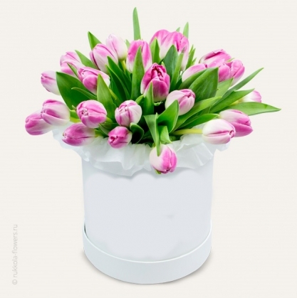 Розовые тюльпаны в шляпной коробке