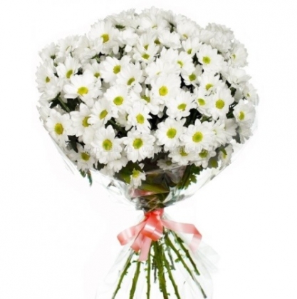Букет из кустовых хризантем в пленке перевязанный лентой