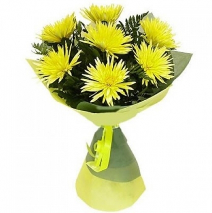 Букет из желтых одноголовых хризантем с добавлением папоротника в двойном фетре