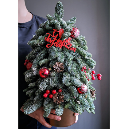 Композиция сделанная из живых веток нобилиса в виде елочки в красном наряде. Такая композиция станет лучшим подарком к Новому году и украсит ваш дом, офис и конечно новогодний стол! Огромный плюс композиций из нобилиса это то, что они практически не осыпаются и стоят до трех месяцев при умеренном поливе один раз в неделю.
