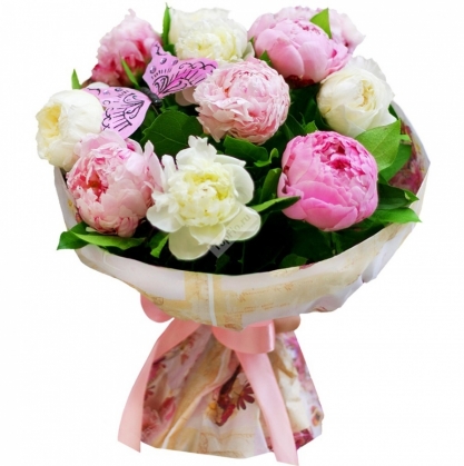 Букет из белых и розовых пинов в красочной упаковке. Для украшения букета добавлен рускус и декор.