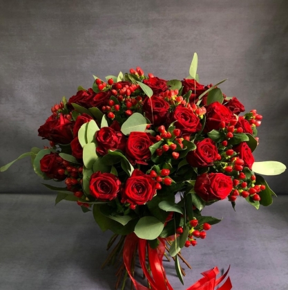 Стильная композиция с розами и гиперикумом "Страстный вечер" | Купить в Королеве