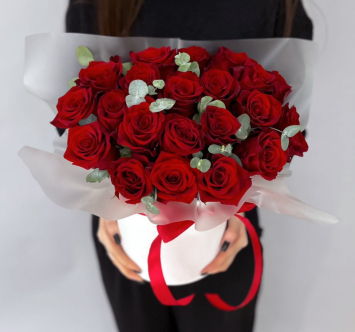 Коробка из 25 роз с эвкалиптом